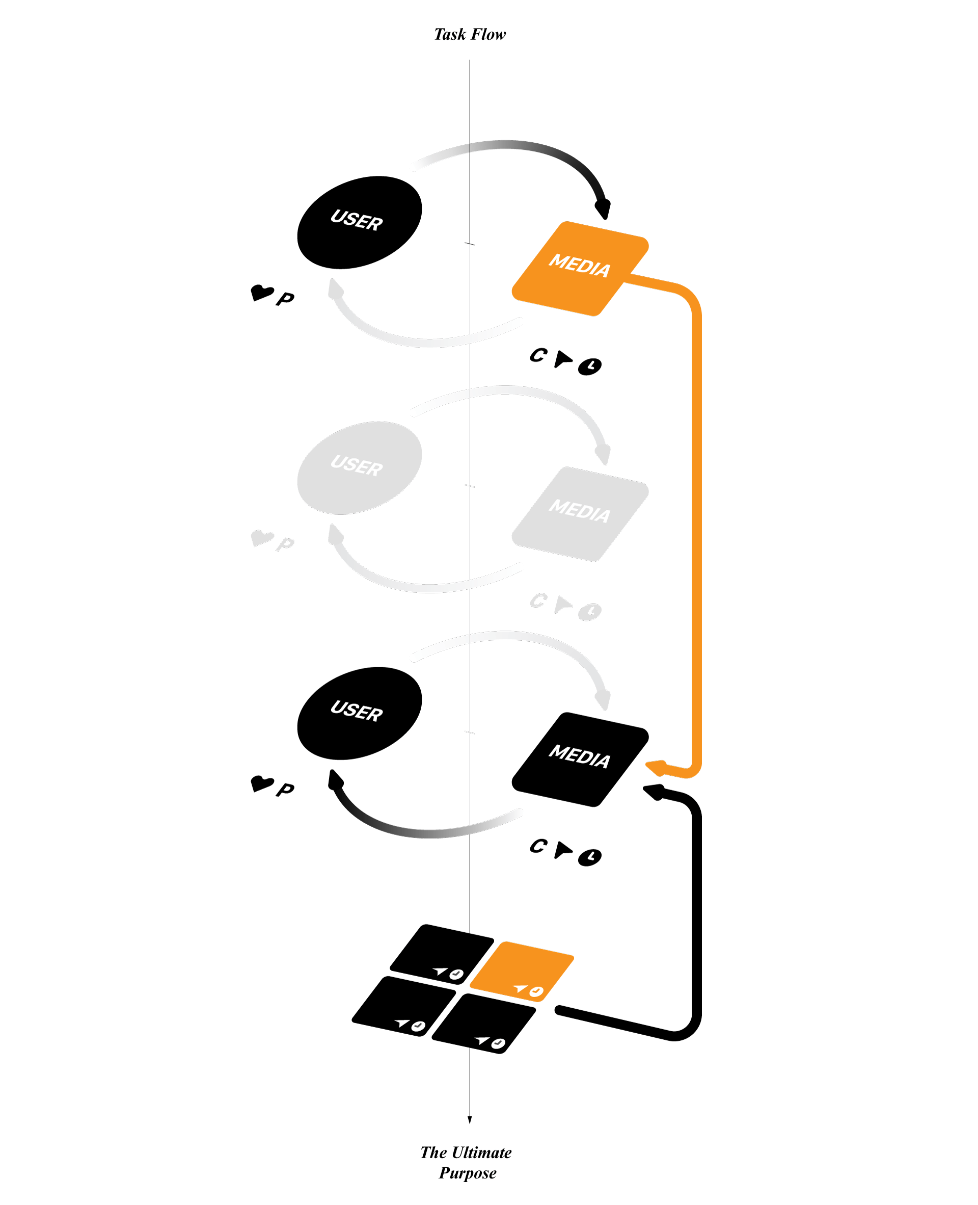 跨场景、串联起媒介间的输出流(橙色箭头),笔者管它叫“决策捷径(或决策虫洞)”, 这条捷径(虫洞)除了表面上缩短了用户行为路径之外,更重要的一个特征就是捷径(虫洞)始末,主客体的输入输出关系发生颠倒置换,始端主体向客体主动输入,末端则是客体向主体主动输入。