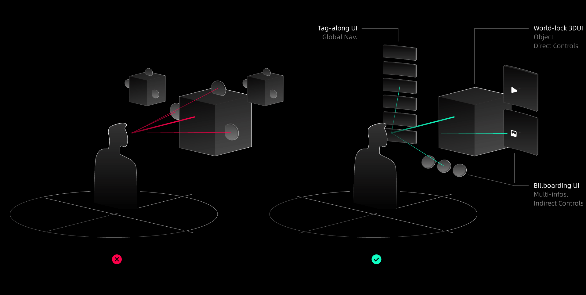 Excessive freedom of 3D interactions, inadequately display of efficient 2D information such videos, images and indirect controls, which will reduce the efficiency of interaction and at the same time lead to a low Return on Investment of model making. UI elements need reasonable design: use world-lock 3D UI elements for directly interactive objects, billboarding 2D UI elements following the subject object for auxiliary information or indirect operations, and Tag-along 2D UI following the user's line of sight for global navigation and information.