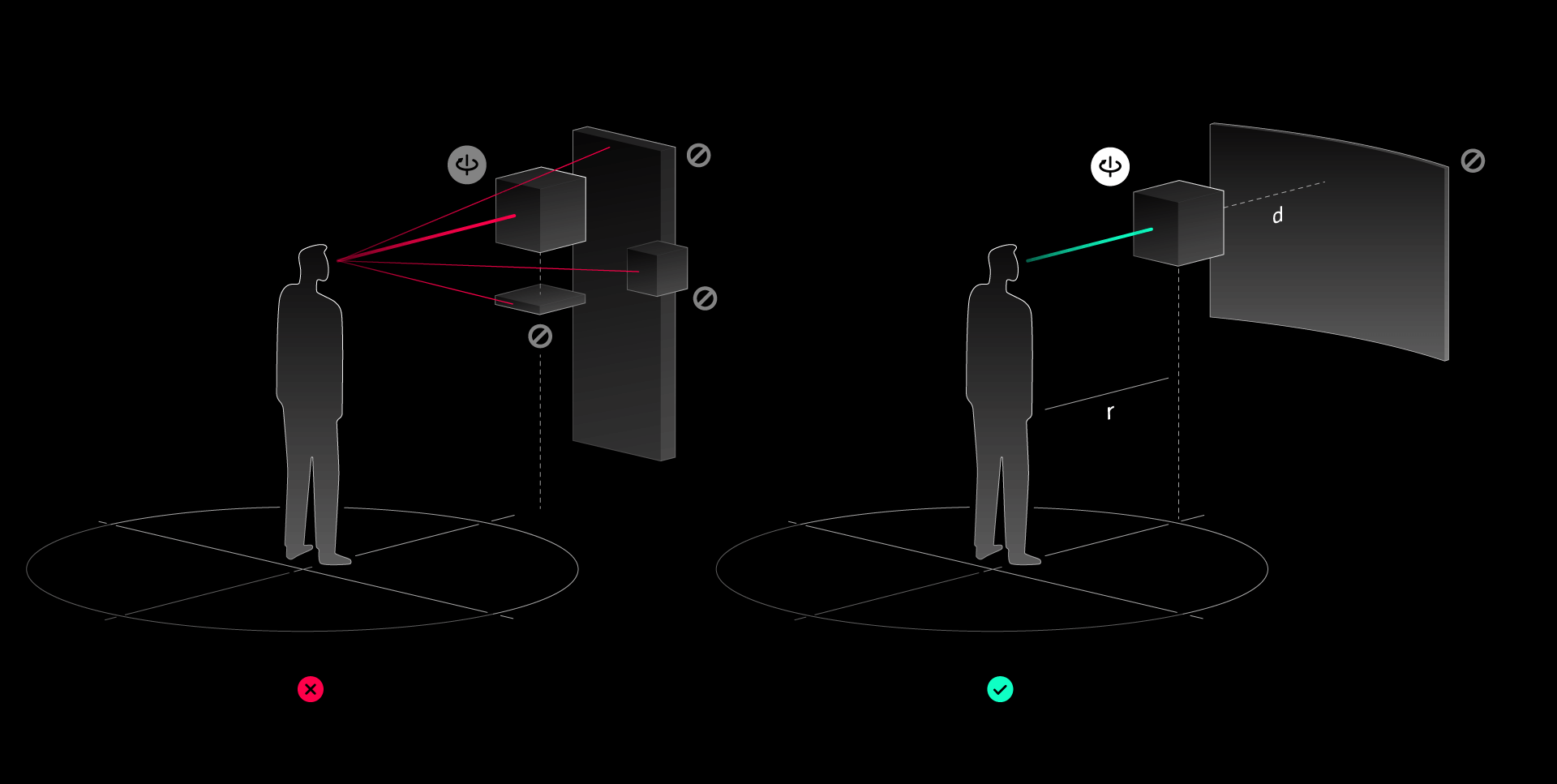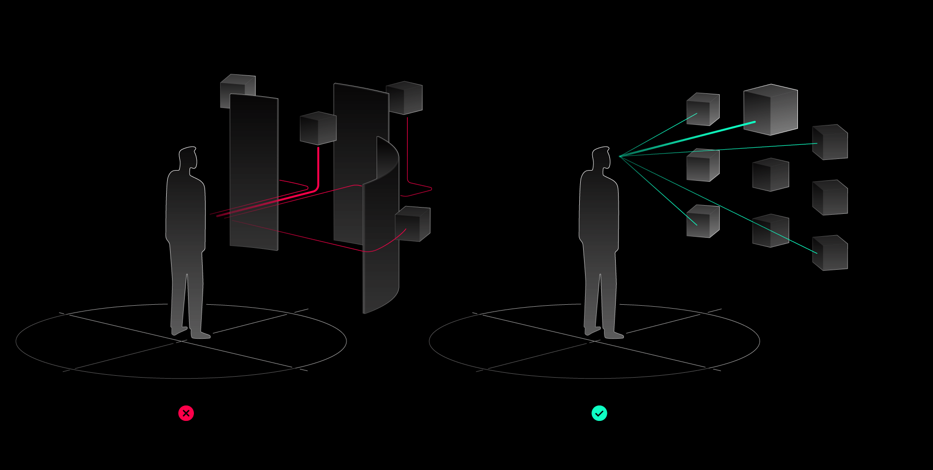 Mixing primary and secondary object elements, rendering all objects equally without distinction in front of the line of sight, and weak expression of interaction guidelines can lead to weak object recognition for primary interactions. Avoid the above problems by means of the layout and proportional relationship between objects and space canvas, functional visibility of objects for interactive operation, and appropriate design of space atmosphere.