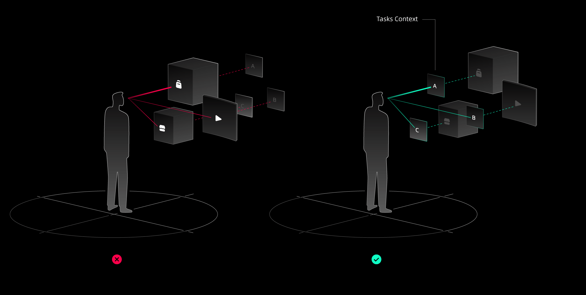 No clear task context can lead to unfocused purpose of user behavior. No primary and secondary relationship between discrete tasks can lead to a lack of perceived value of the product's core functionality. Therefore, when designing an efficiency-oriented XR product experience, it is important to communicate clearly the action tasks at Main/First level of information hierarchy, and to convey the primary and secondary position of multiple tasks by means of classification and subjectivity perception principles.