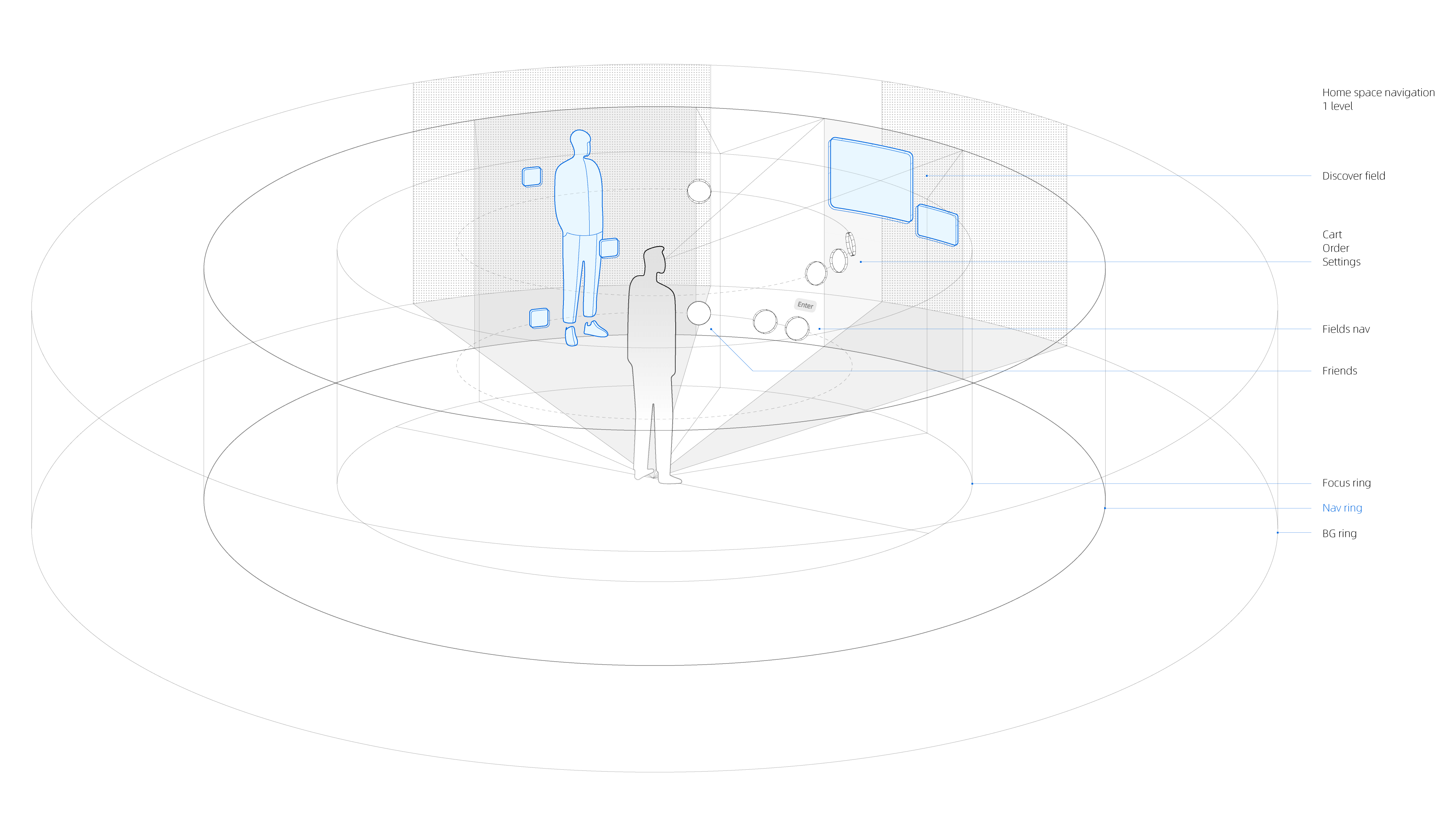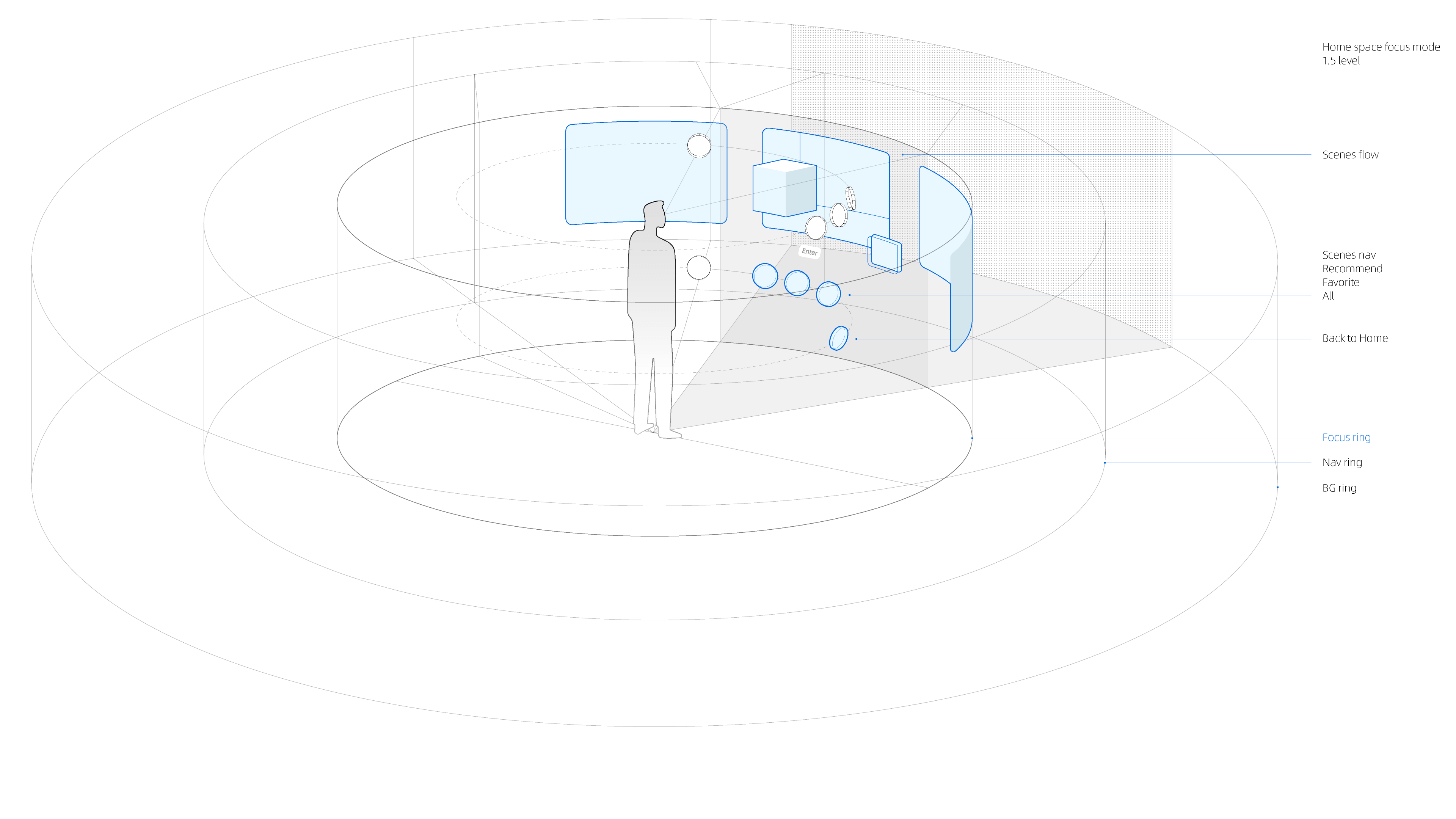 Taking XR-shopping platform-based multitasking product as an example, after determining the function and specific information structure (not shown), the core 3d wireframe is drawn. Home space navigation is in level 1. Focus Ring, Navigation Ring and Background Ring are set according to the object and user distance. For example, the discover content field and virtual wardrobe in home space appear in the nav ring as the distribution entrance, when the user enters any of these task scenes, the content of level 2 will appear in the focus ring, and of course the background ring is always in the farthest layer.